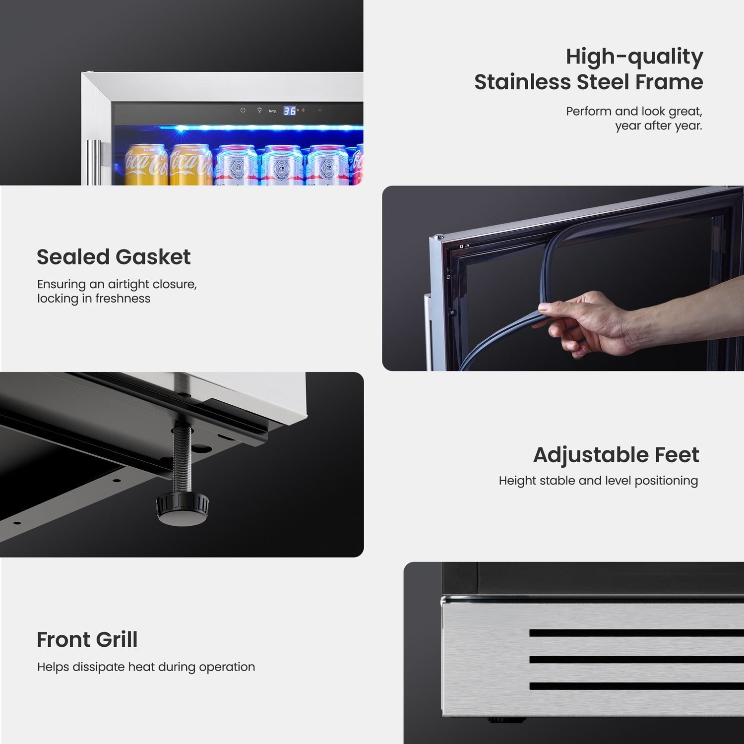 - Quiet and Vibration-Free Operation: Designed with a low-noise, 42-decibel compressor and vibration-free technology, this beverage cooler ensures a peaceful environment. The quiet operation allows it to be placed anywhere in your home, from the kitchen to the office or entertainment area, without disturbing your activities or relaxation.