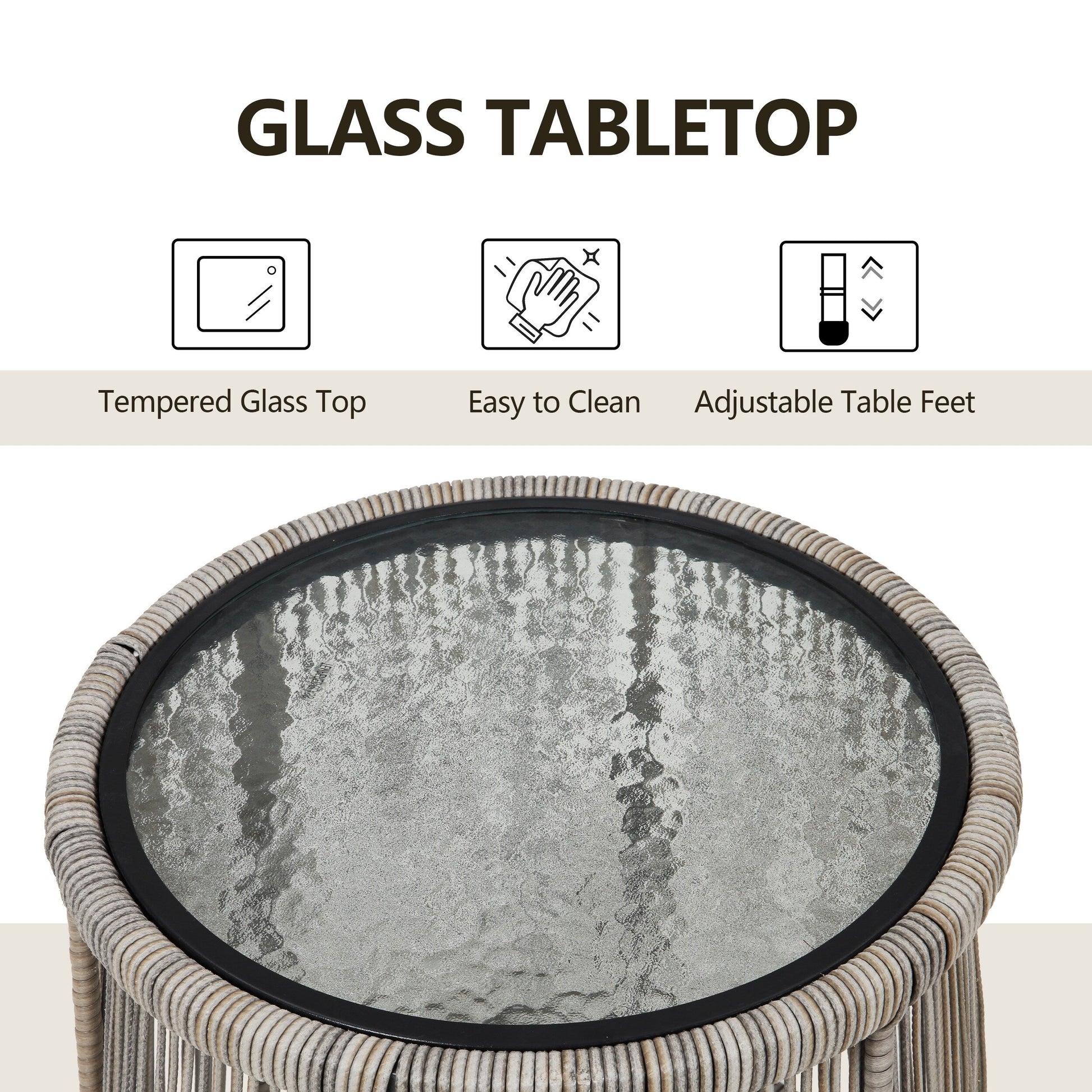 Our outdoor wicker furniture set made with high quality PE rattan material and a solid steel frame, this balcony furniture set is durable and has long life span, allowing you to enjoy it for years to come. Outdoor bistro set features and elegant glass top side table perfect for a couple glasses of wine or the morning coffee and newspaper. Its weather resistance characteristic help you make quick clean come to fruition. Coffee table with tempered glass can clear up the water stain in one minute. Ergonomically engineered for ultimate comfort, Stylish porch chairs come with thick sponged cushion and adjustable feet plugs for more indoor and outdoor use. This outdoor patio furniture set is suitable for poolside, lawn, garden, patio, backyard and so on. It will bring you a more comfortable experience to have a rest at the leisure time.