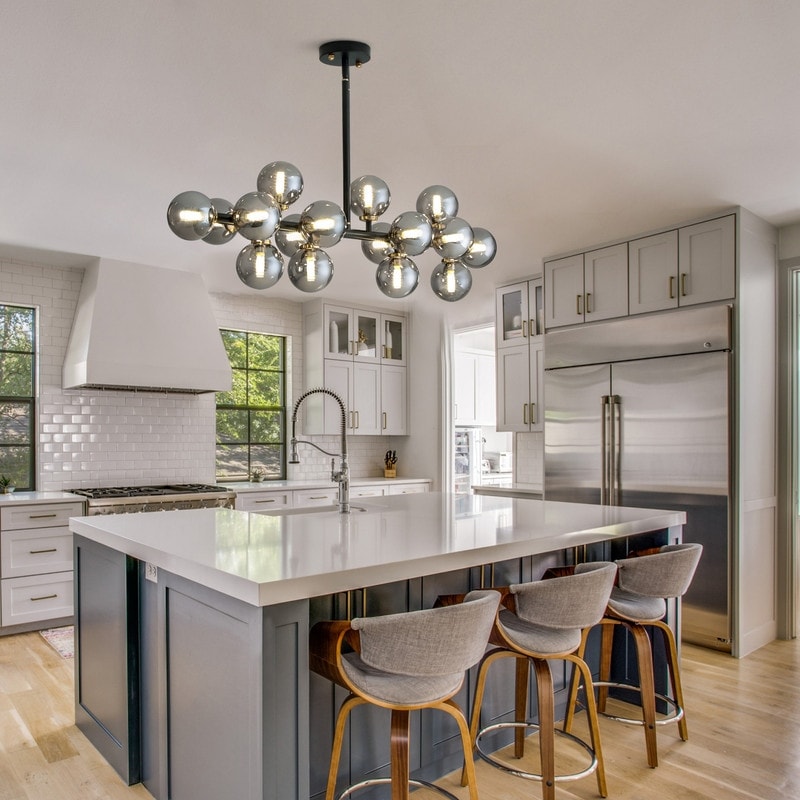 - Unique Design: This mid-century modern gold kitchen chandelier adopts a linear metal frame and milky white glass globe lampshade. The dining room chandelier over table is simple and classic, makes soft light, and no glare, and is ideal for the dining room, kitchen island, and the bedroom.