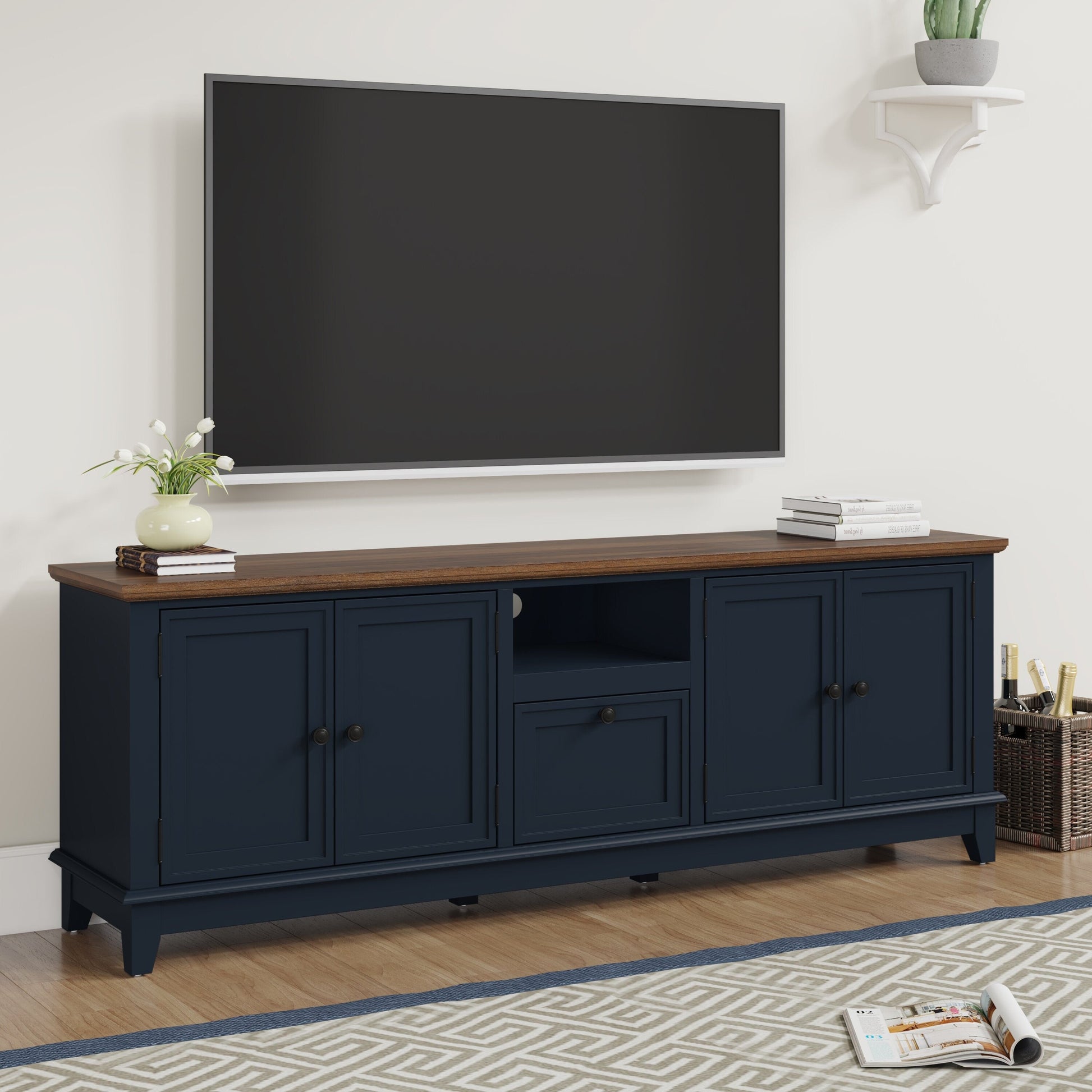 Elevate your entertainment space with our 72-inch TV stand, meticulously designed for both style and functionality. Featuring spacious left and right cabinets, adjustable shelves, and a large central drawer with an additional hidden compartment, this TV stand offers ample storage for all your media essentials. The wood-grain textured top and vibrant blue finish of the cabinets break away from monotony, adding a touch of sophistication to your living room. The adjustable shelves and quick-install hinges make assembly a breeze, saving you valuable time.