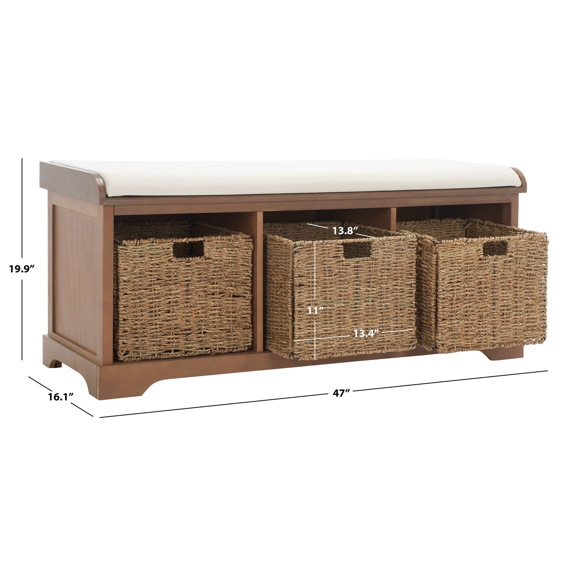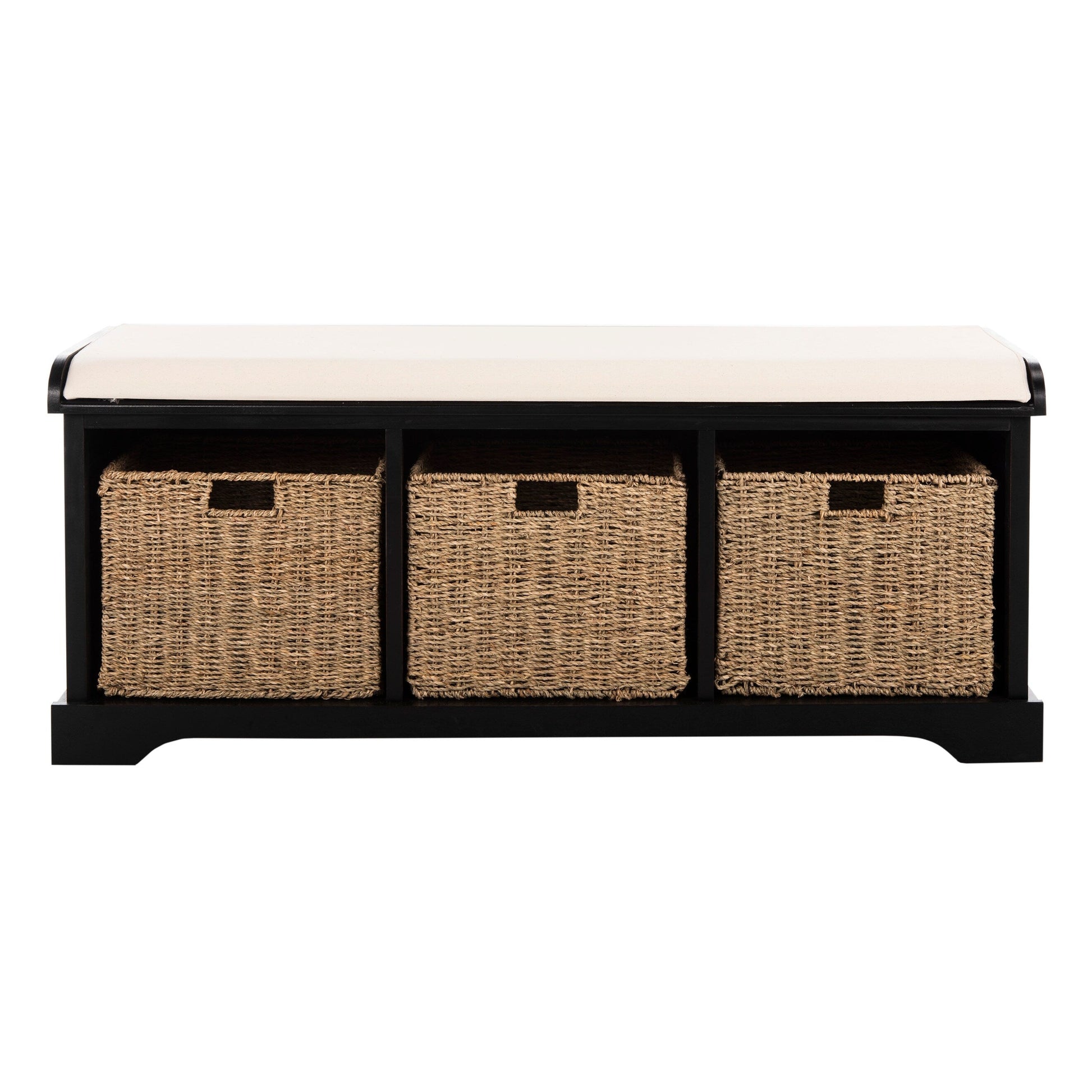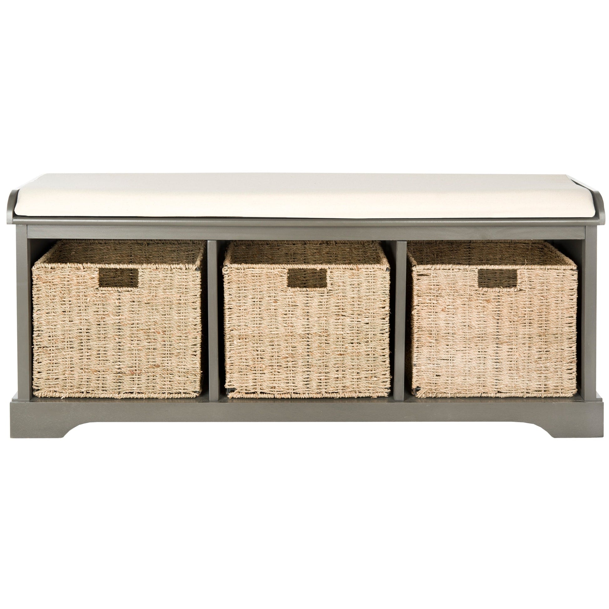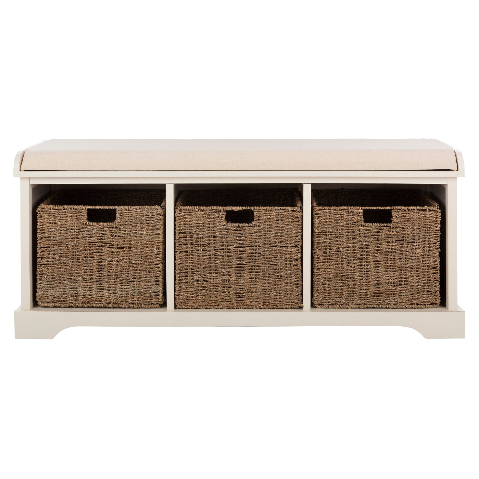 The Storage Bench is the perfect perch for removing boots in an entryway or garden shoes in the mud room. Crafted of pine in a smooth finish, this piece's three removable woven baskets provide no fuss storage, and a white cotton cushion completes the look with comfort and farmhouse charm.