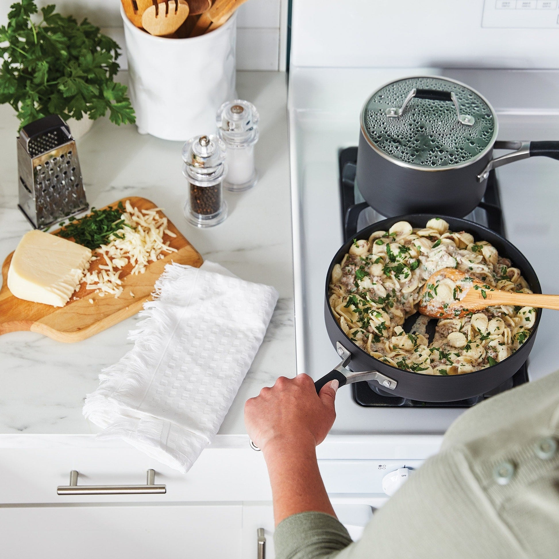 An essential addition to any kitchen, Select by Calphalon Hard-Anodized Nonstick Cookware helps you cook more smoothly thanks to its improved* easy-release surface. Featuring AquaShield nonstick technology, this cookware line performs like new 40% longer* for remarkable food release over and over again.・Water-based AquaShield nonstick technology keeps pans performing like new 40% longer (vs. previous generation of Select by Calphalon)・Dishwasher-safe for easy cleanup・Long silicone handle stays cool on the stovetop・Oven-safe up to 400 degrees F, so you can easily go from stovetop to oven・Tempered glass lid・Set includes: 8-inch Frying Pan, 10-inch Frying Pan, 1.5-quart Sauce Pan with lid, 2.5-quart Sauce Pan with lid, 3-quart Saute Pan with lid, 6-quart Stock Pot with lid, Solid Spoon, Slotted Spoon, Pasta Fork, and Slotted Turner・Compatible with most stovetops, including gas, electric, and glass・Limited 10-year warranty