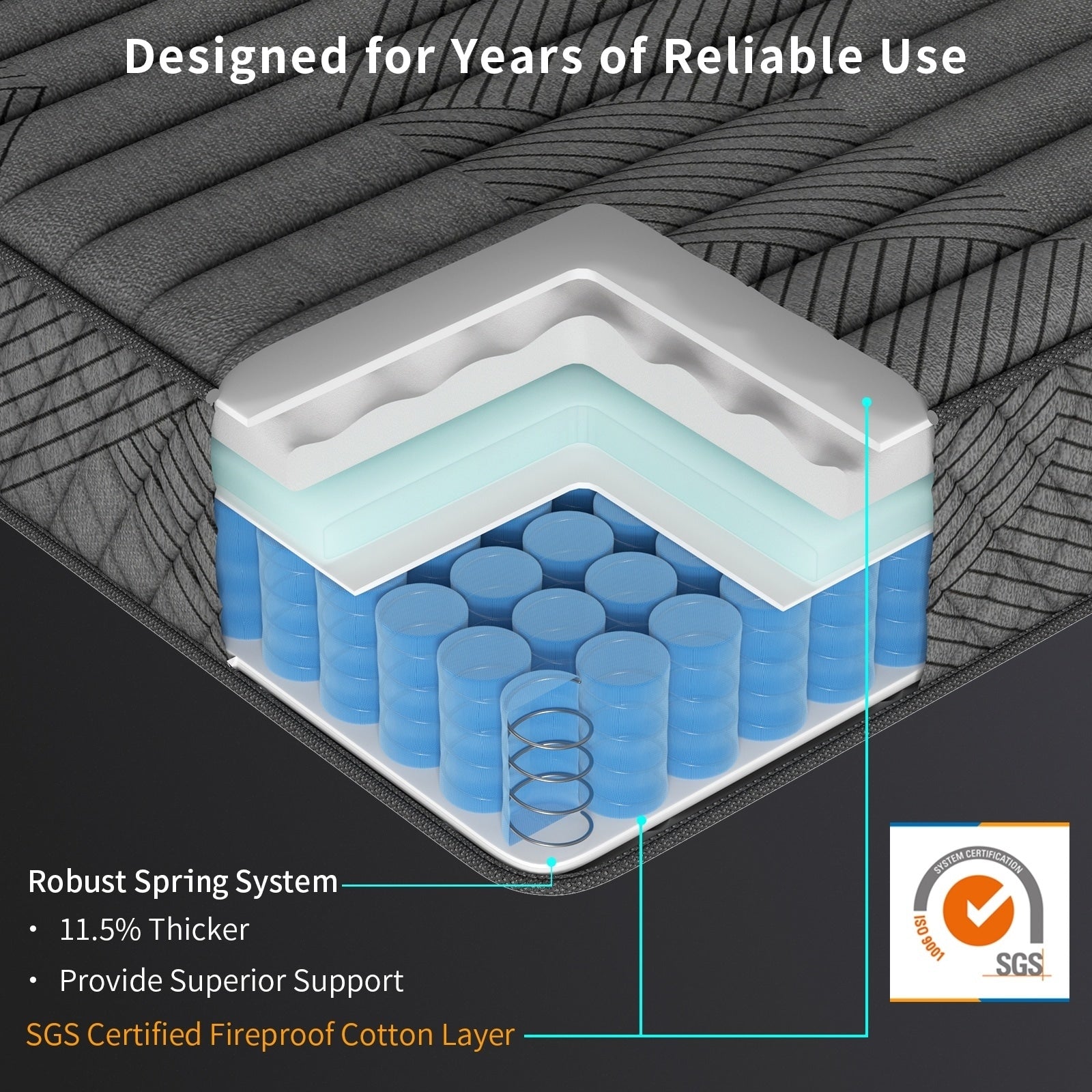 - Coil springs 11.5% thicker than market standard: Provides better support, longer lifespan, and prevents collapsing.